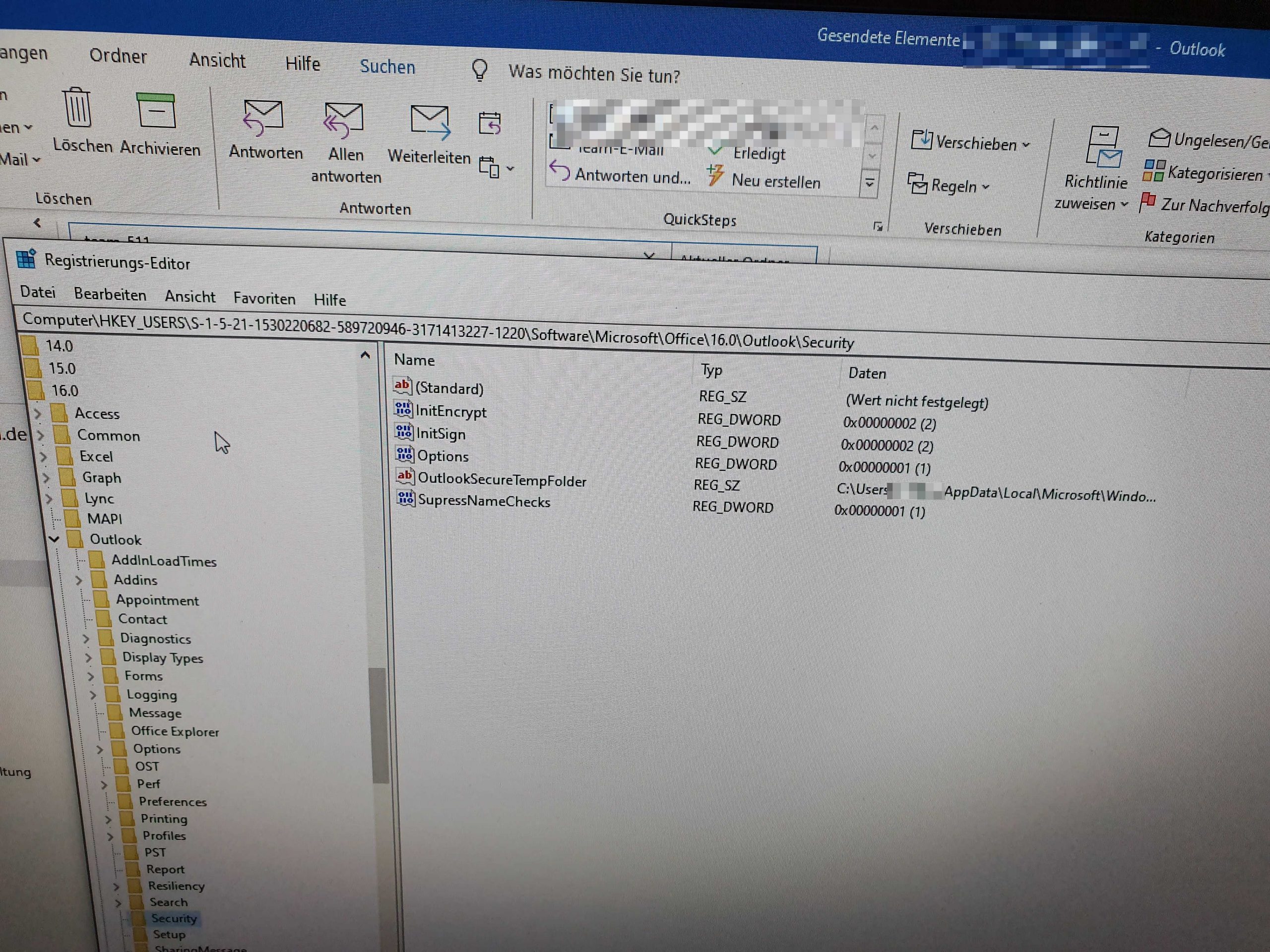 2. navigiert zu dem Pfad HKEY_USERS\langer UID Key\Software\Microsoft\Office\16.0\Outlook\Security (Hinweis: der UID Key ist immer unterschiedlich und muss erst ermittelt werden, es stehen aber nicht viele zur Auswahl, in der Regel 2-3 Stück nur)